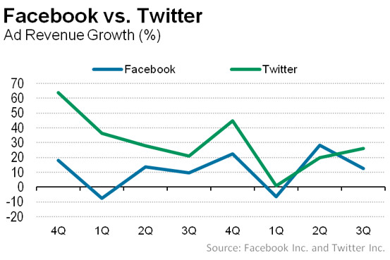 Take a look at the chart below. This chart compare the two company`s ads-revenue growth. Twitter is much younger than Facebook but Twitter`s ad revenue is following similar trajectories.
