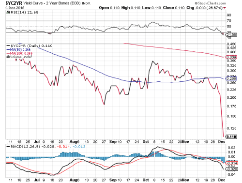 The wide spread between the 2-year note and the 10-year note is around 10 basis points which is the flattest since 2007. Bond prices move in the opposite direction of yields, and the spread between the 3-year note and the 5-year note have already inverted. 1-year note and 10-year isn`t near at all.