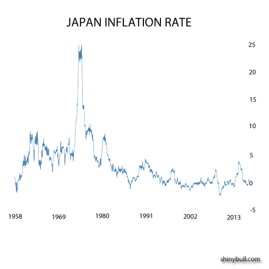 As you can see from the chart above, Japans inflation increased the early 90s and then it started to decline again. You can see from the chart that it went up again in the late 90`s, but not for a long time. It drops every time it goes up.