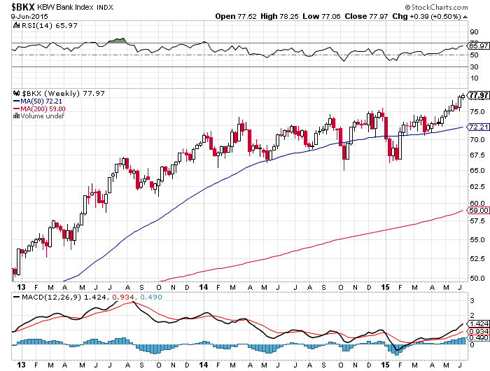 What`s going on? Higher rates is good for the banks because they can charge more for loans and earn more because of bigger profits on the spreads between loan rates and deposits. Buoyant outlook for the U.S economy in the second half of 2015, and the expected interest rate hikes blows up the banking index.