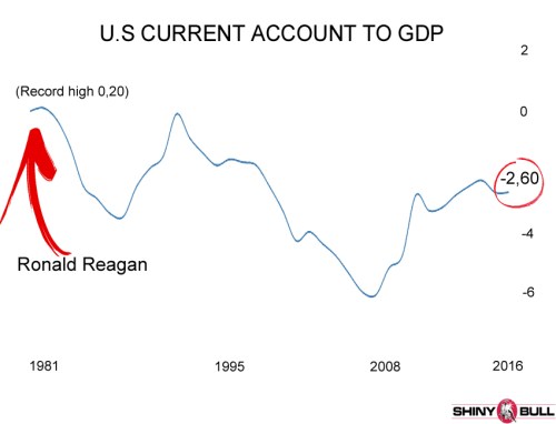 The U.S recorded a current account deficit of -2,60% of the country`s GDP in 2016. It reached an all-time high of 0,20% when Former President Ronald Reagan was inaugurated in 1981, but it declined all the years under his presidency.