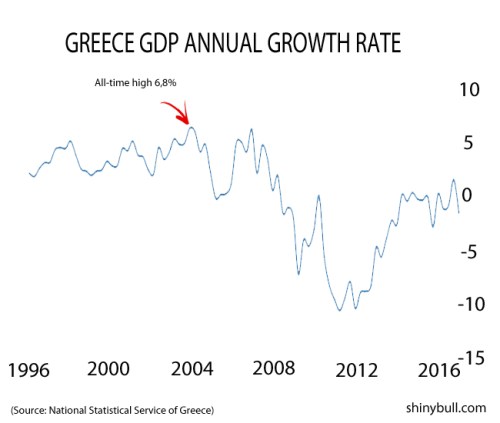 Their productivity was sky-high only a few years ago. In 2003, the GDP was higher than China`s GDP right now. Greece GDP in 2003 was at an all-time high of 6,80 which is impressive. Now, the picture is very different. GDP is down -1,1 percent.